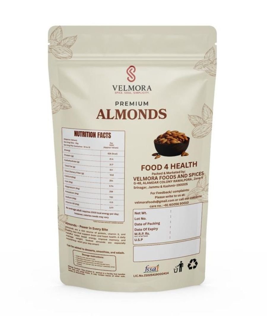 Velmora Almonds are premium quality whole almonds carefully selected for their size, taste, and natural goodness. They are naturally rich in protein and fiber, making them a nutritious addition to your daily diet. Each pack is hygienically sealed to maintain freshness and preserve the natural crunch. Ideal for everyday snacking as well as cooking, Velmora Almonds offer consistent quality you can trust in every handful.