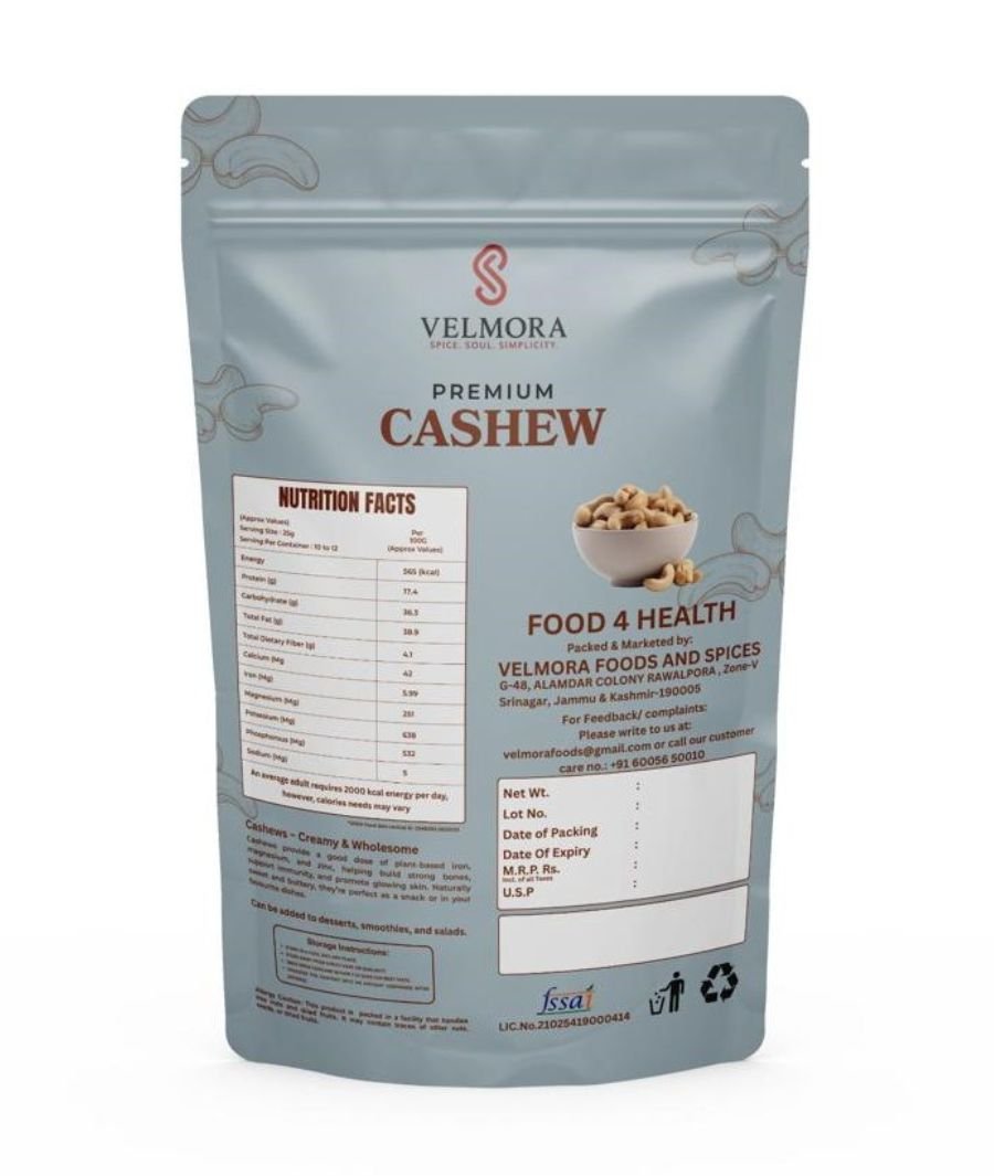 Velmora Cashews are carefully sourced and packed to preserve their natural flavor and texture. Each pack delivers premium quality whole cashews that are fresh, wholesome, and ideal for everyday use. Their rich taste and smooth consistency make them suitable for both traditional and modern recipes.
